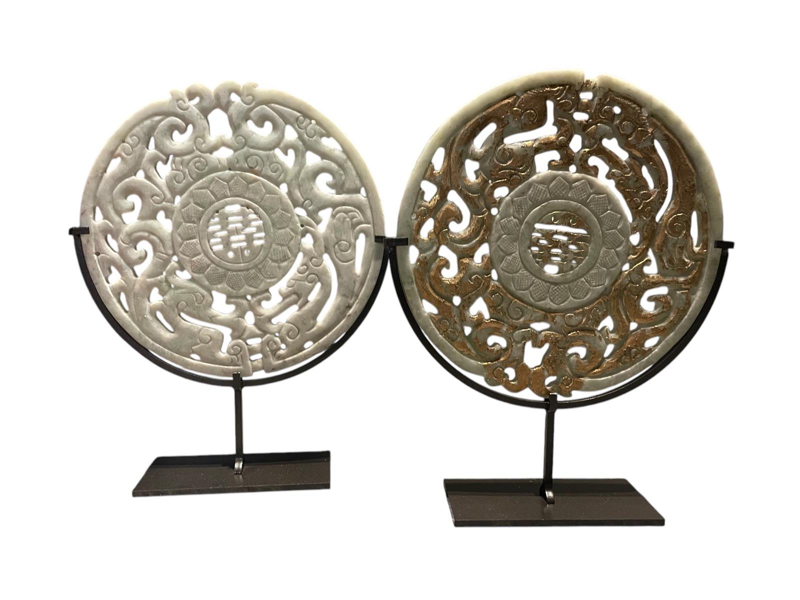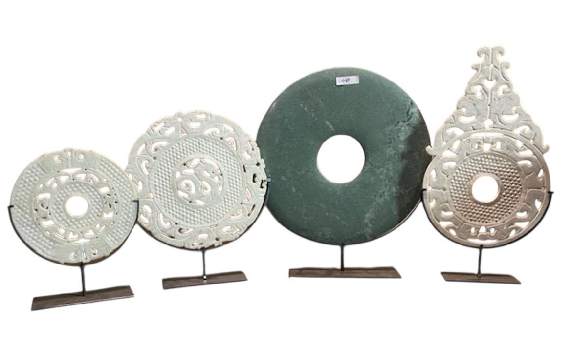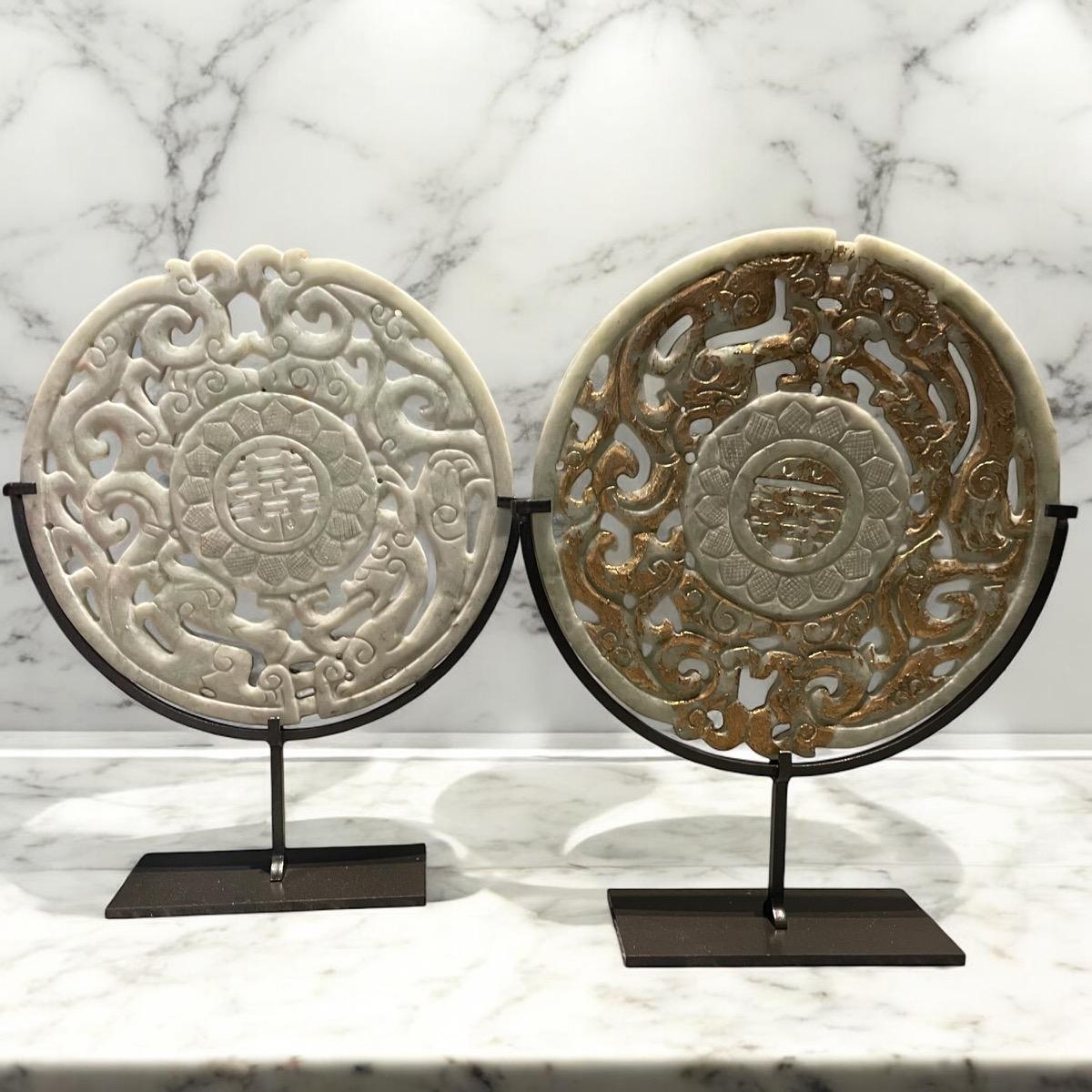 20cm, 25cm and 30cm in Marble & jade. Adorned with dragon motifs and double happiness. White Marble and celadon green Jade, black stone carvings.