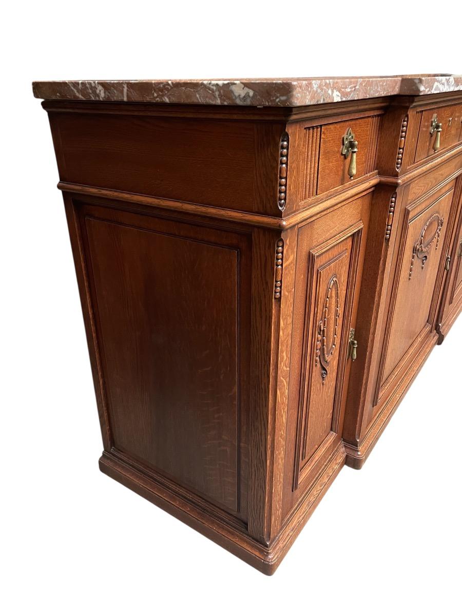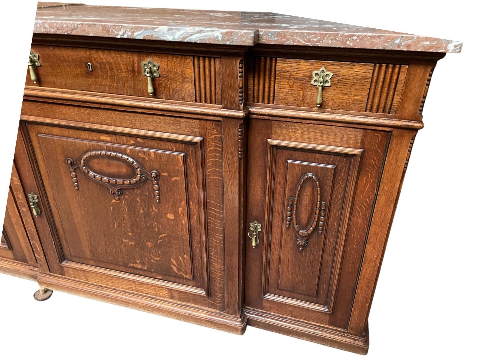 Belgian oak sideboard with marble made up of two parts and sourced from Liège. 2.15m br 0.56cm d x 1.m h