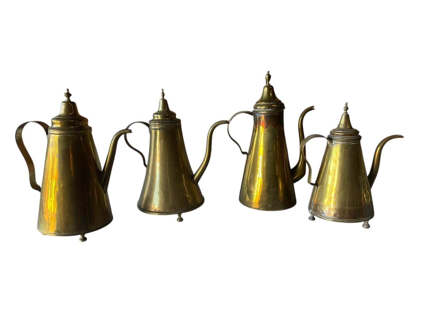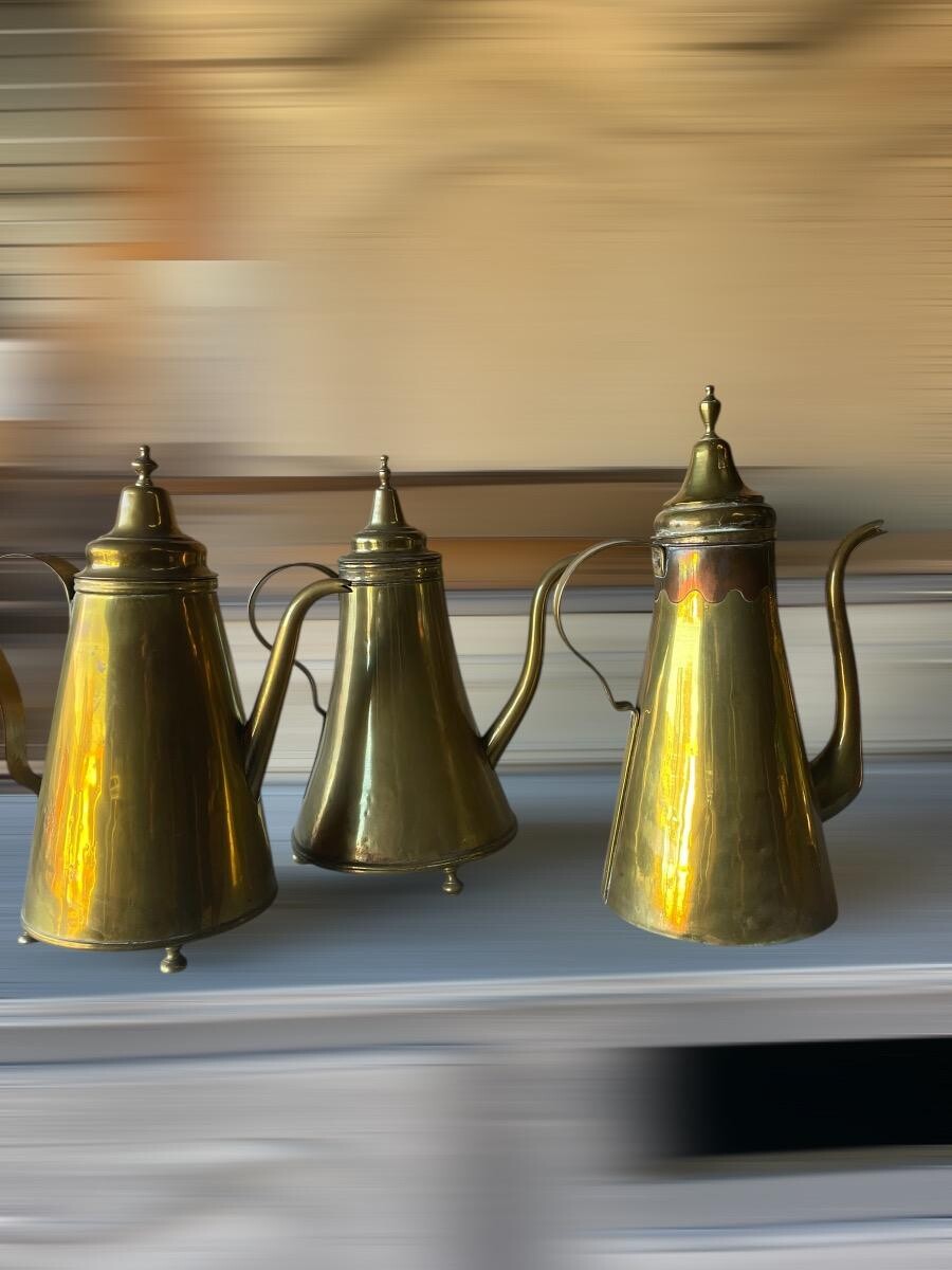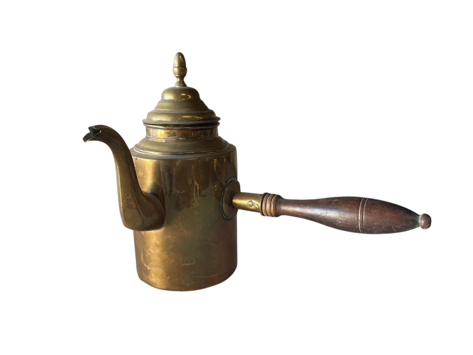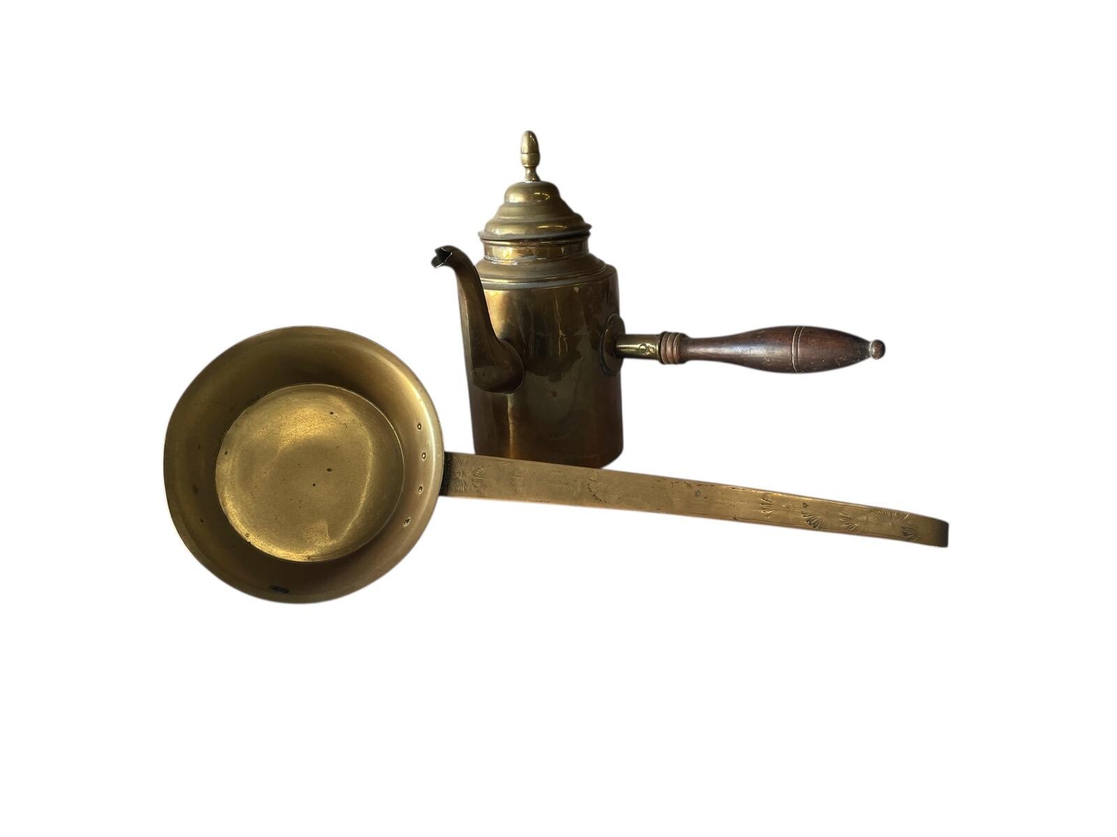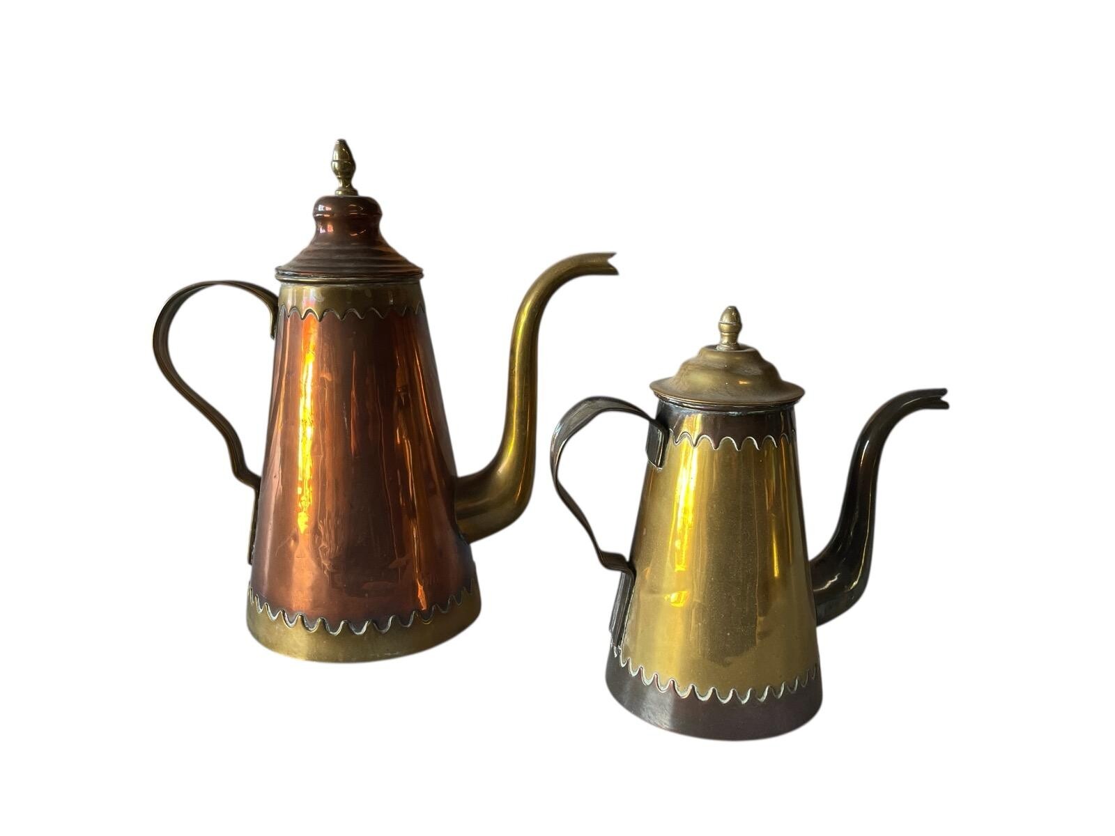 Copper coffee pots and a jug with a wooden handle for hot chocolate Yellow copper pot with embossed decoration and a small red coffee pot adorned with yellow copperwork.