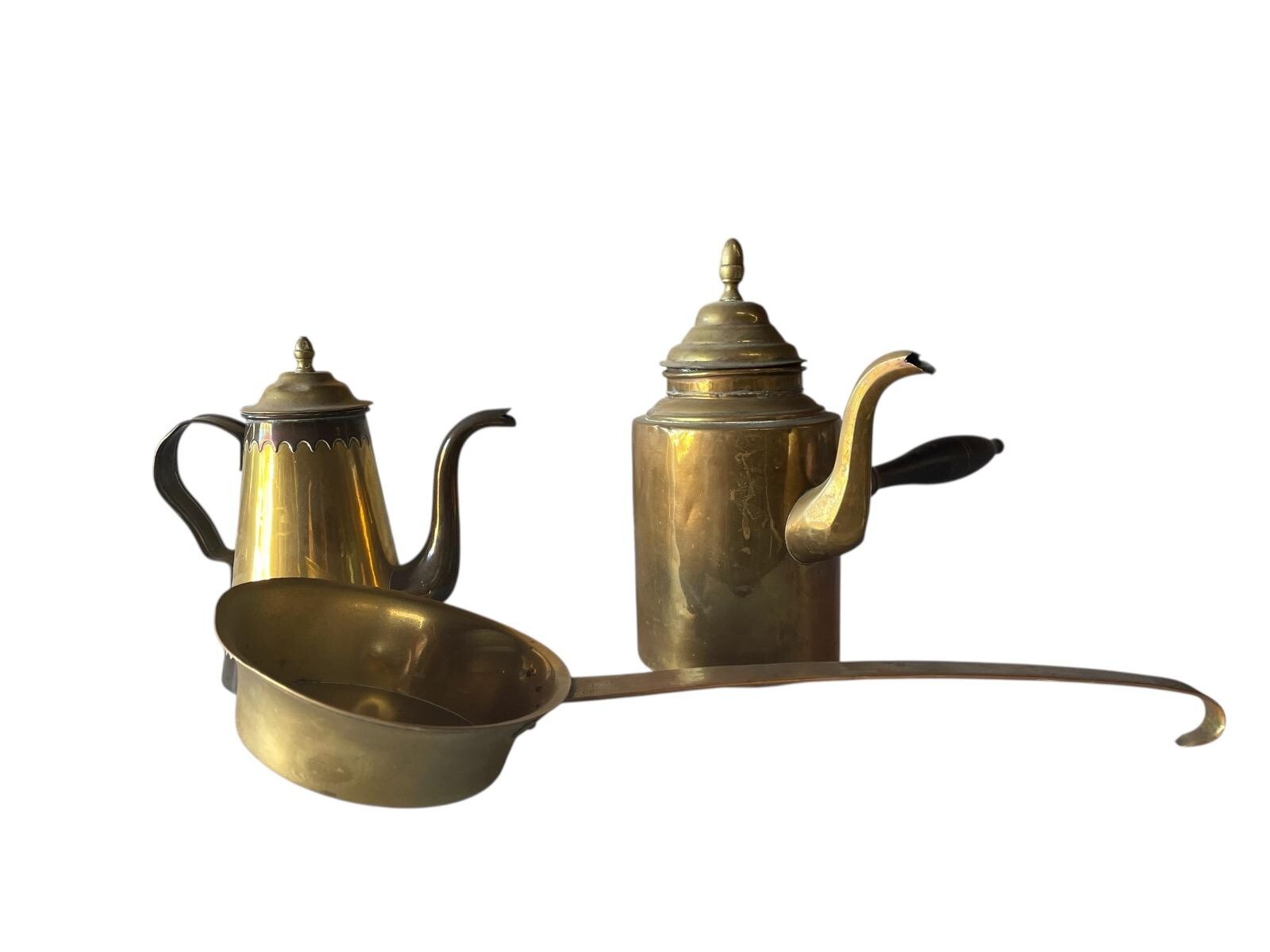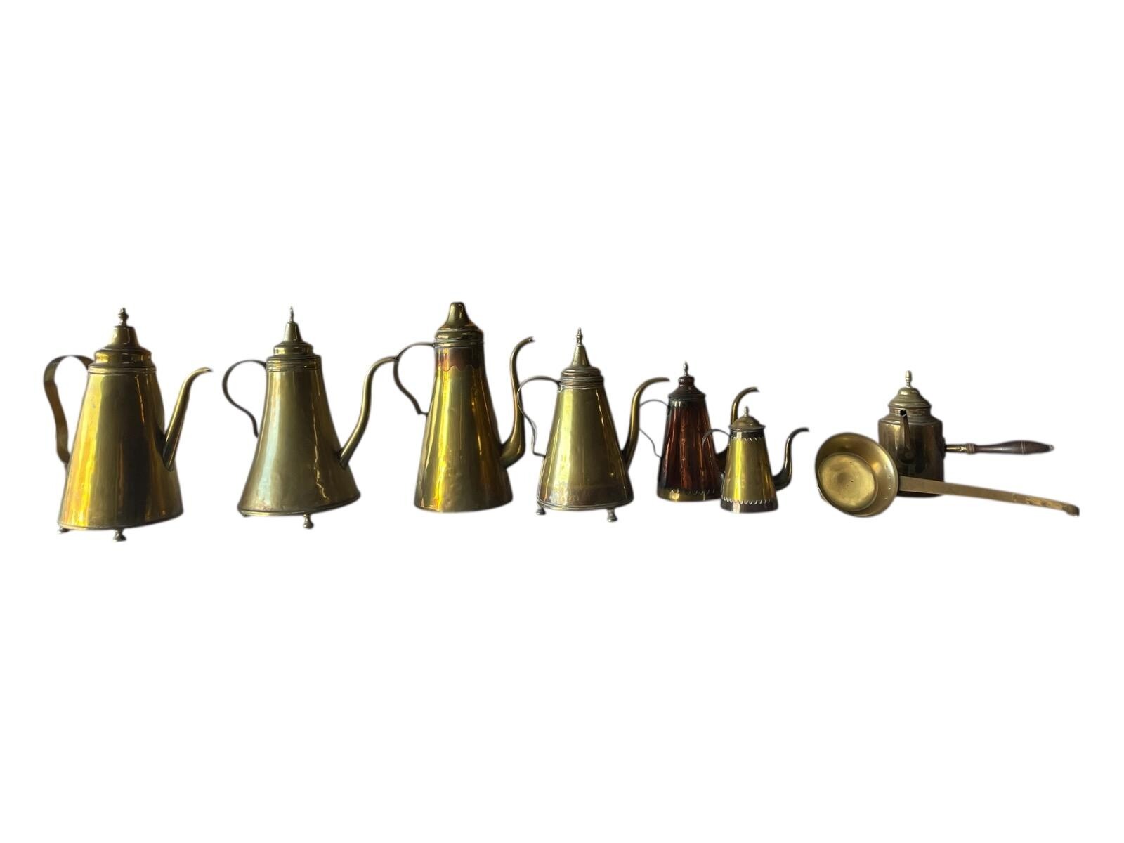 Set of assorted coffee pots and hot chocolate server with a ladle