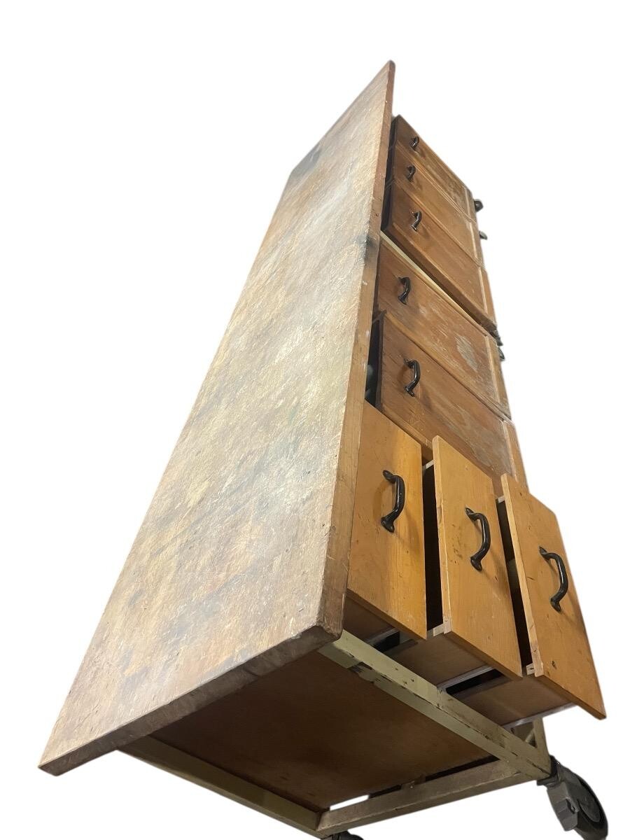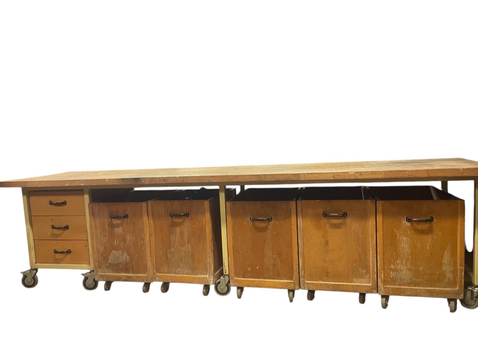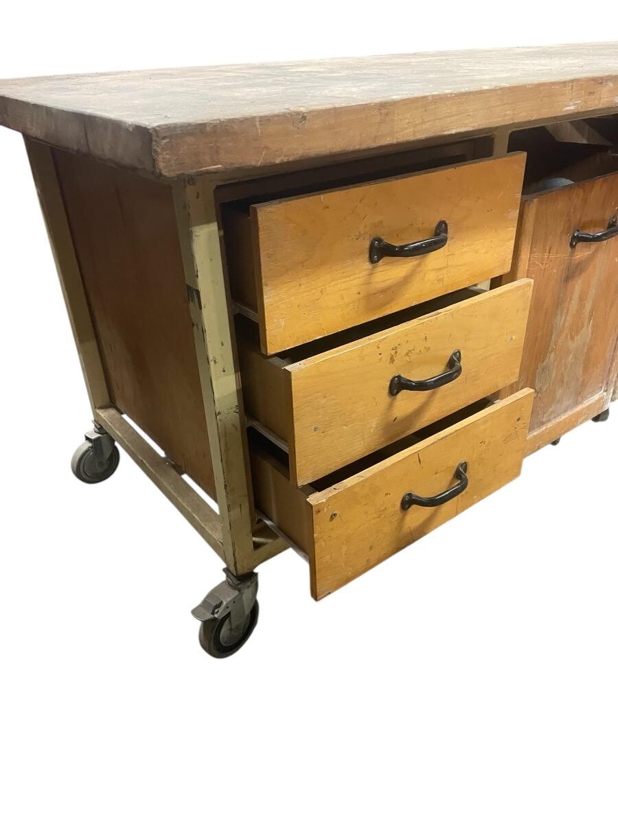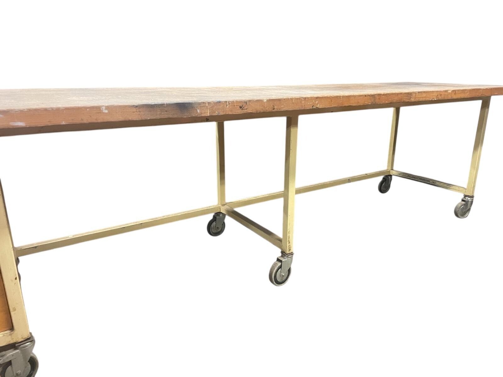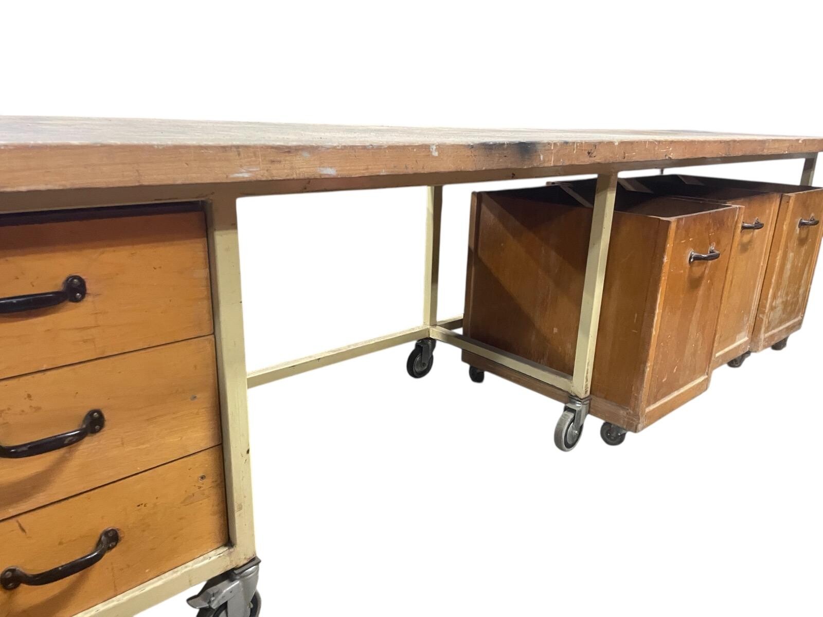 Tafel met groot werkblad op wielen met 3 laden en 4 bakken op wielen. IJzeren frame in originele kleur. .3.70 cm br x 0.80cm D x 0.77cm H