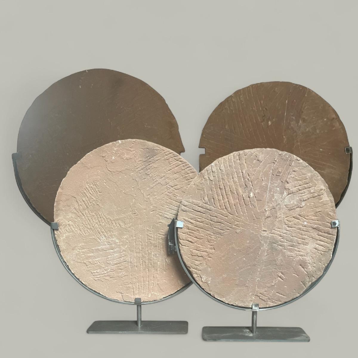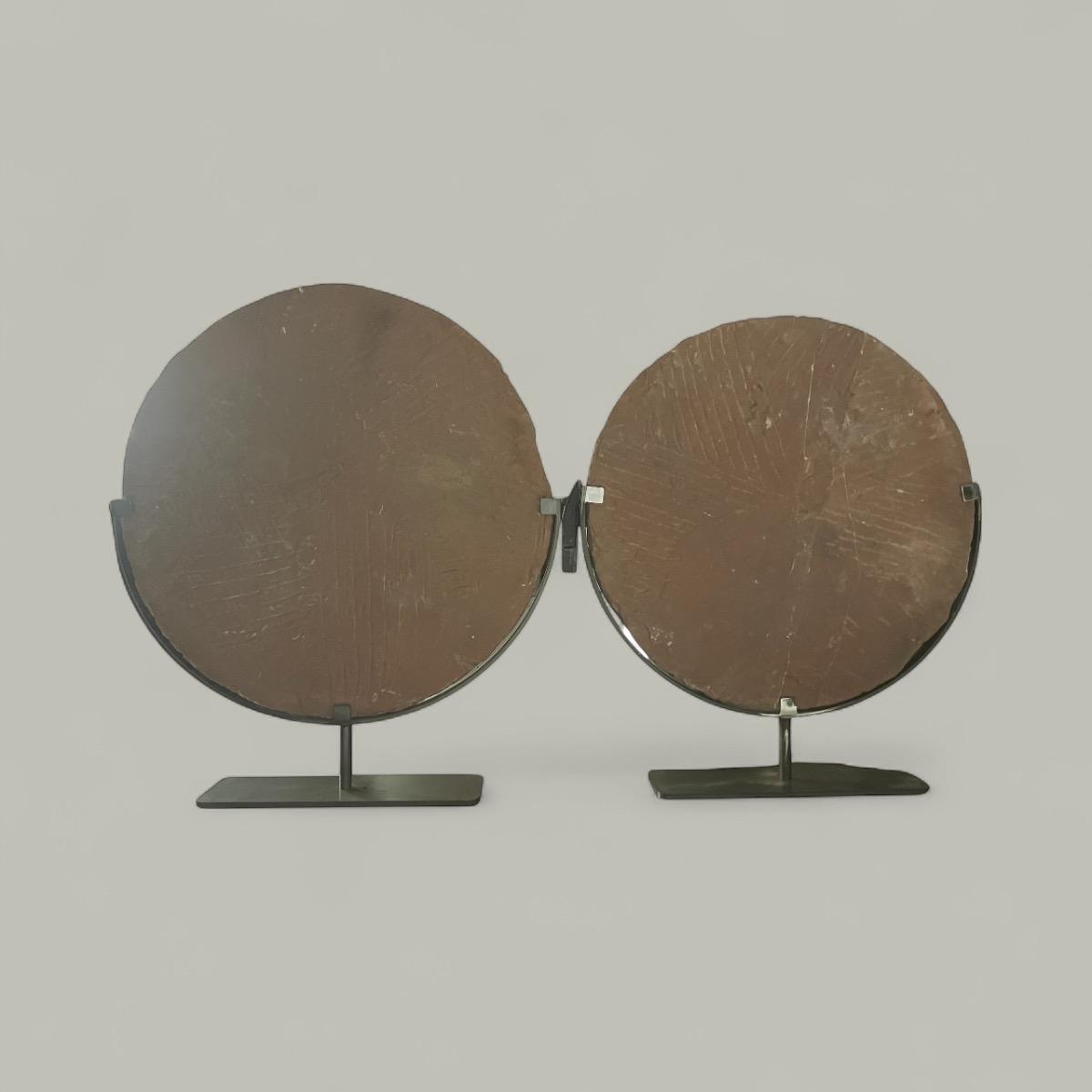 Set van 2x rode aardewerken stenen afdek deksel op ijzeren staanders. Ca 1900