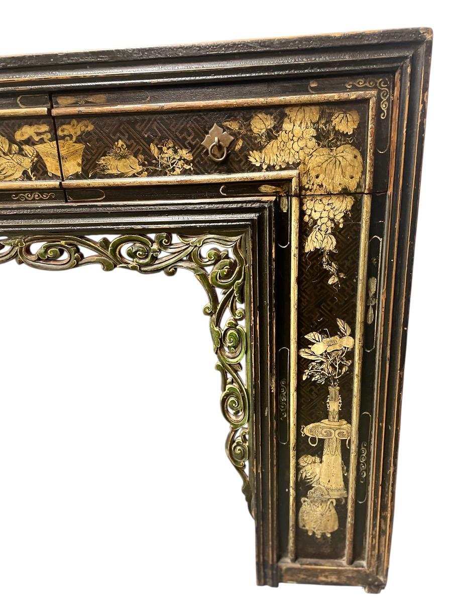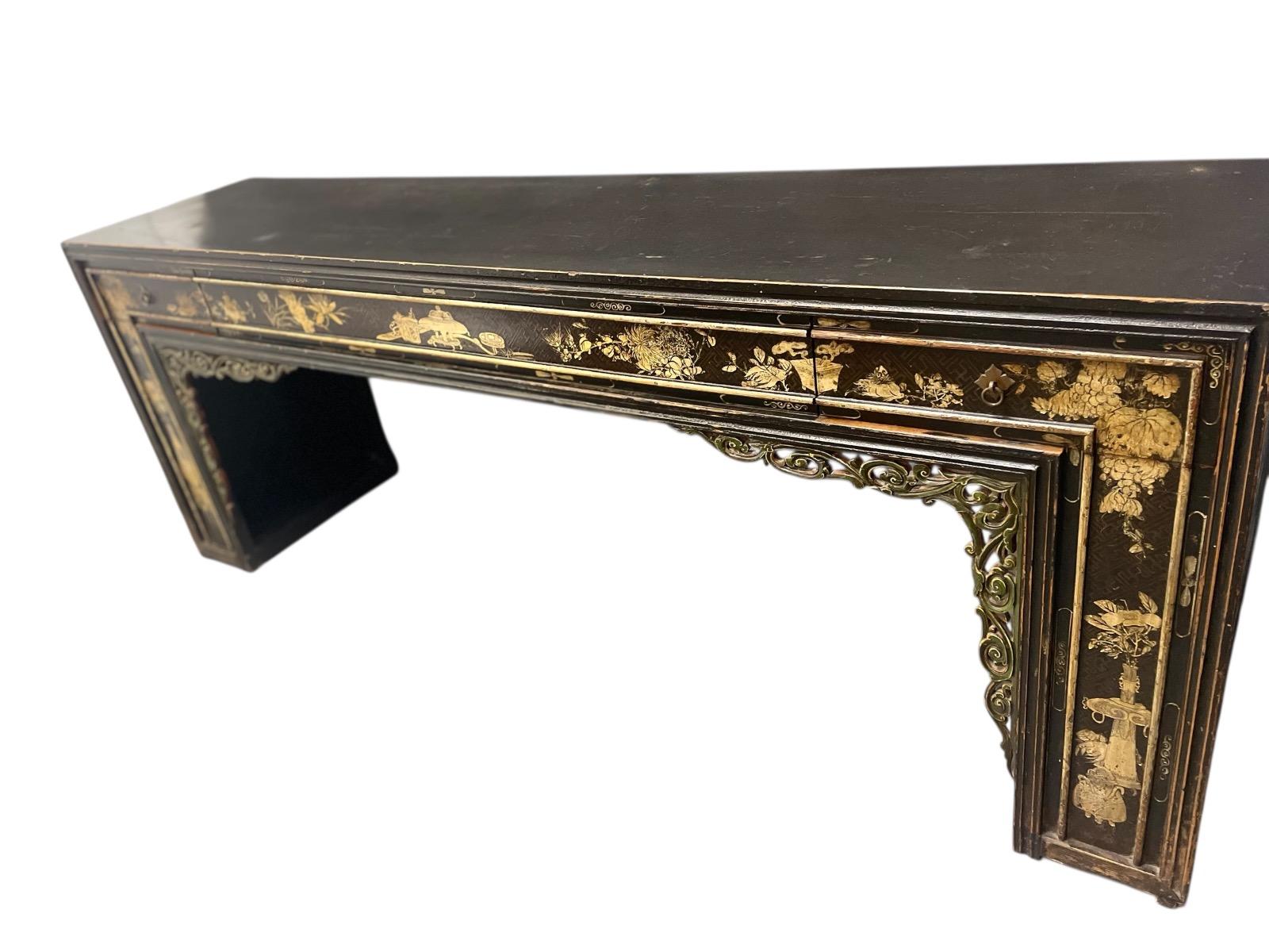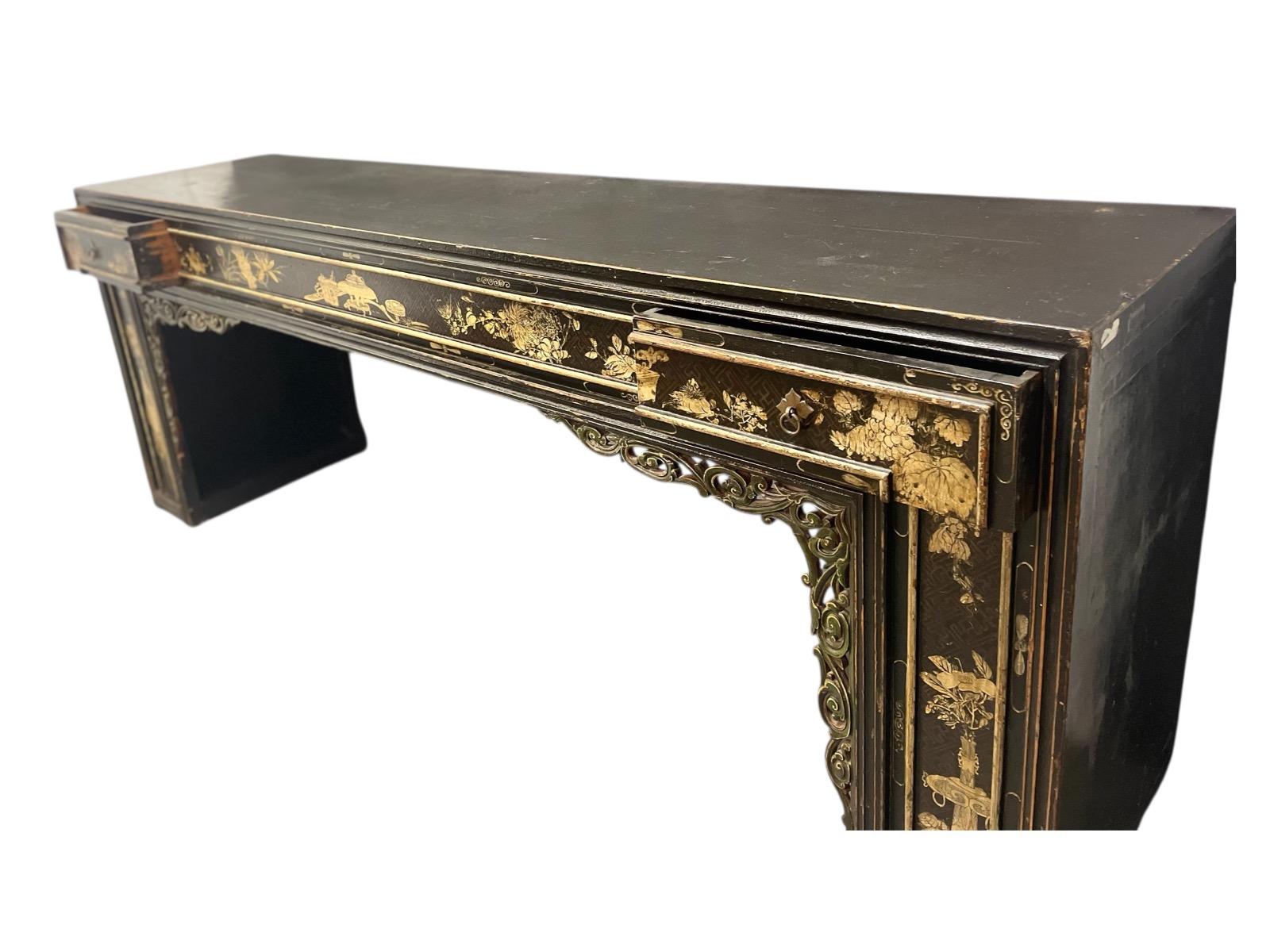 Black lacquered console with drawers and gold leaf images on the front.
