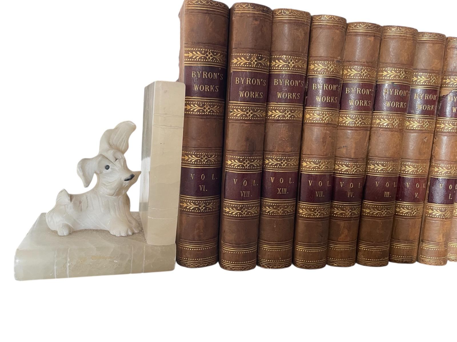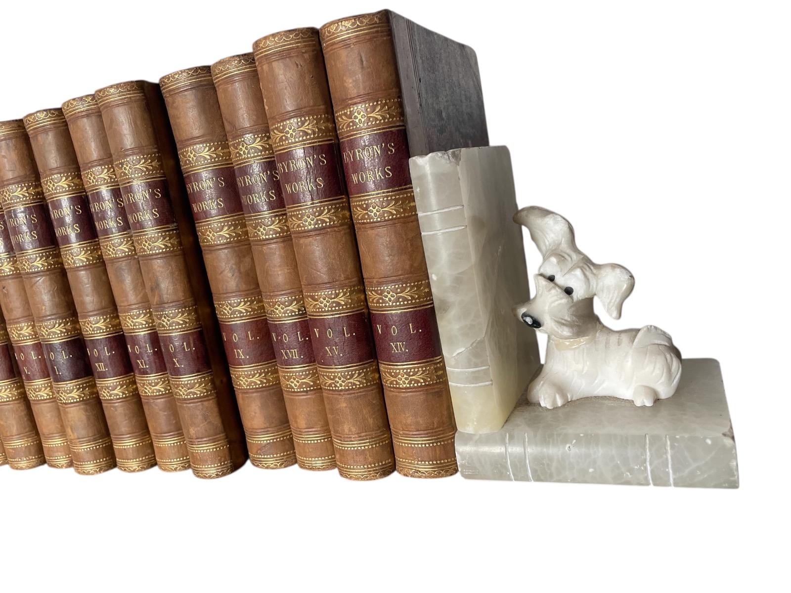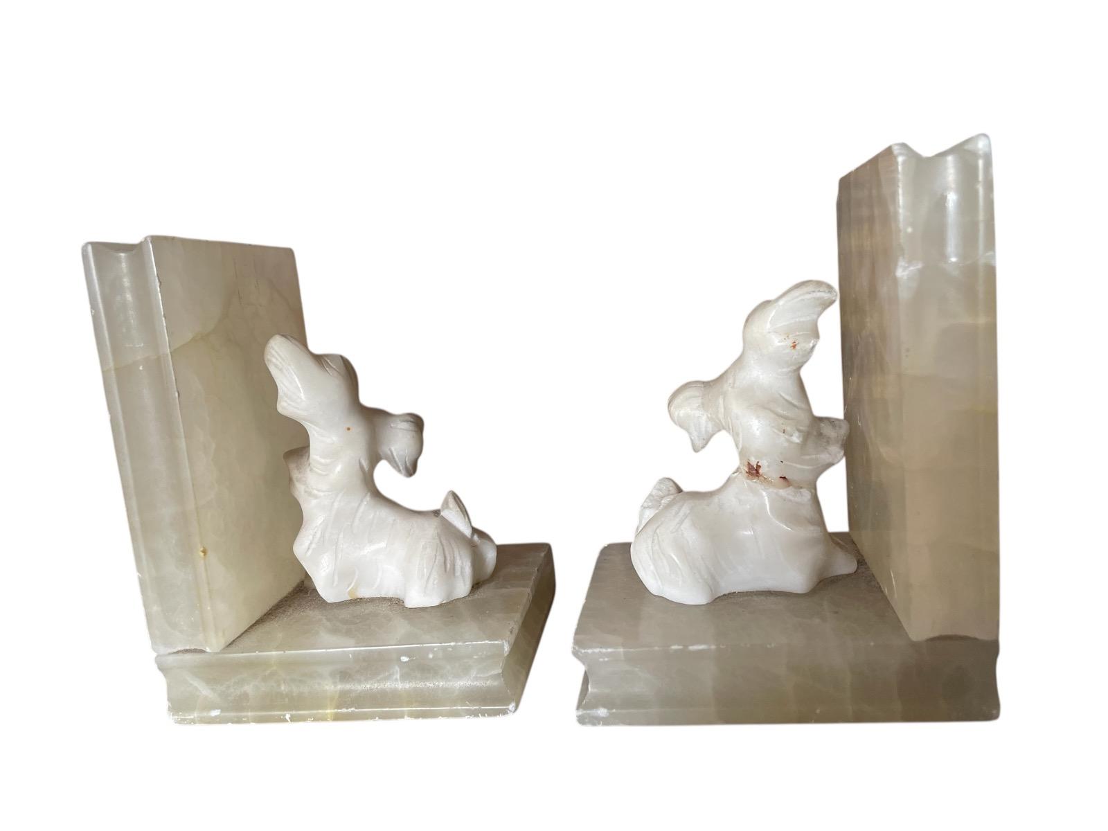 Twee boekensteunen in marmer met hondjes erop ca1920.