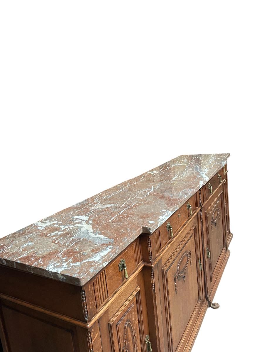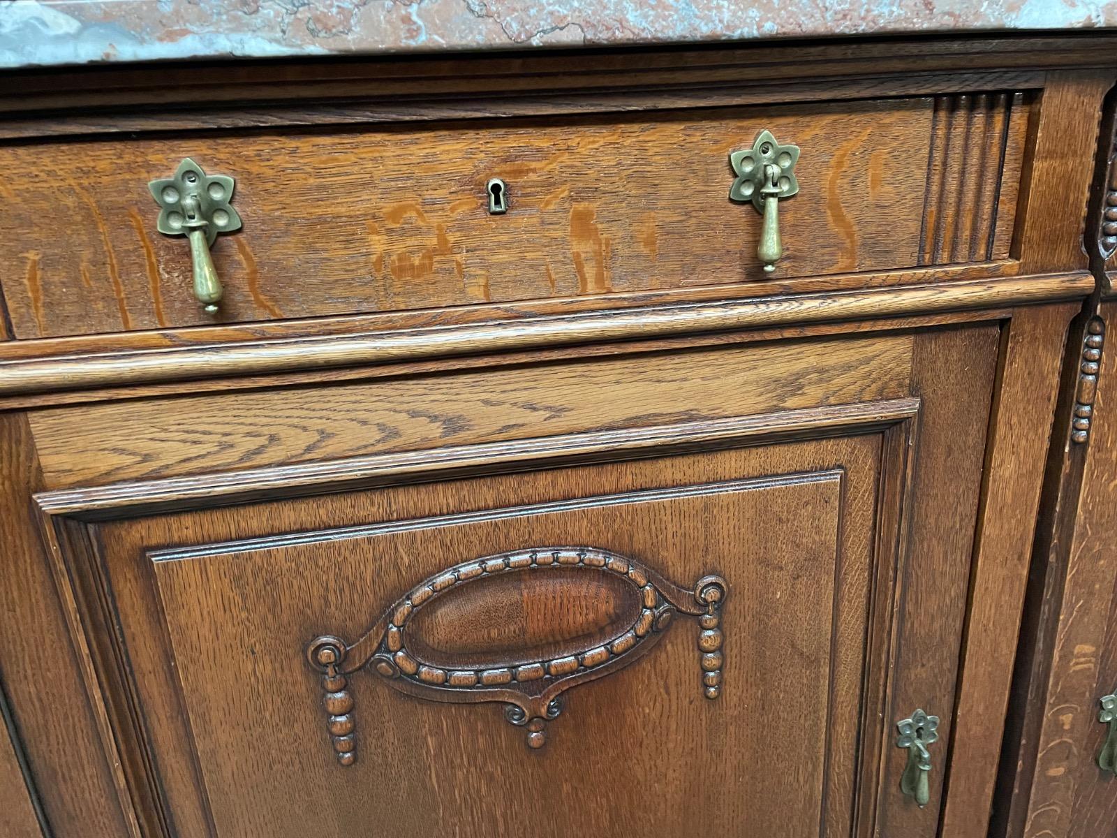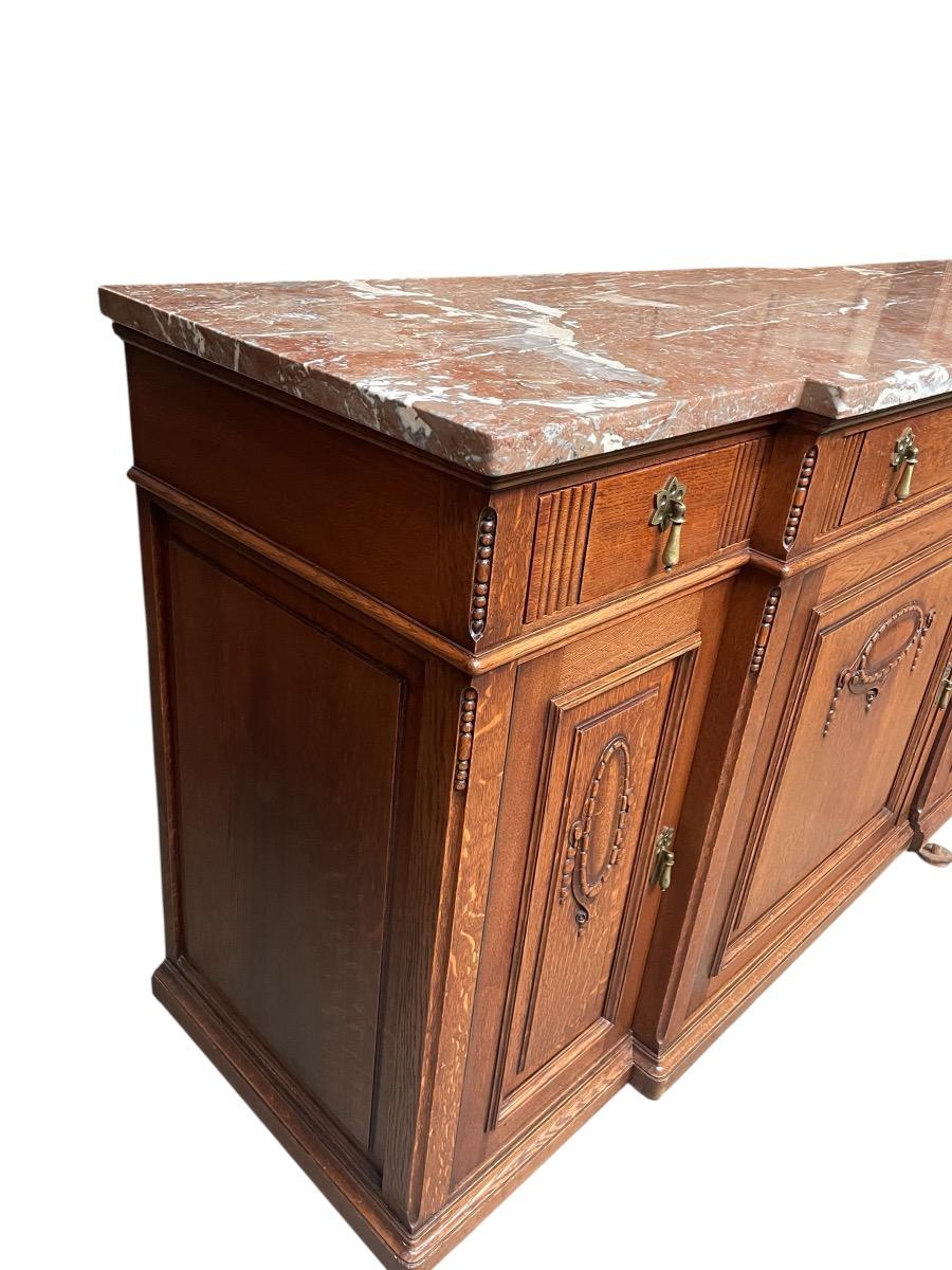 Belgian oak sideboard with marble made up of two parts and sourced from Liège. 2.15m br 0.56cm d x 1.m h