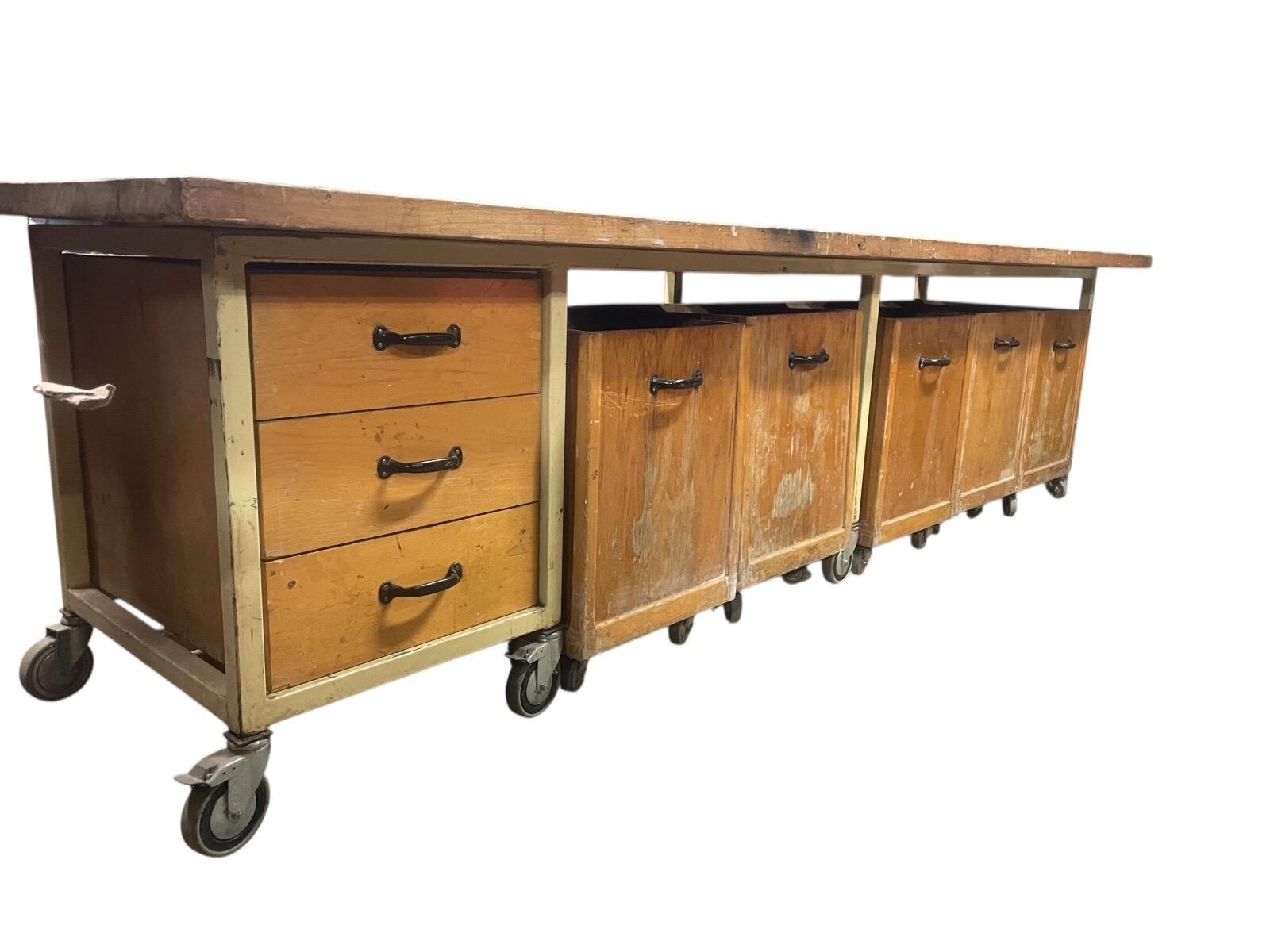 Tafel met groot werkblad op wielen met 3 laden en 4 bakken op wielen. IJzeren frame in originele kleur. .3.70 cm br x 0.80cm D x 0.77cm H